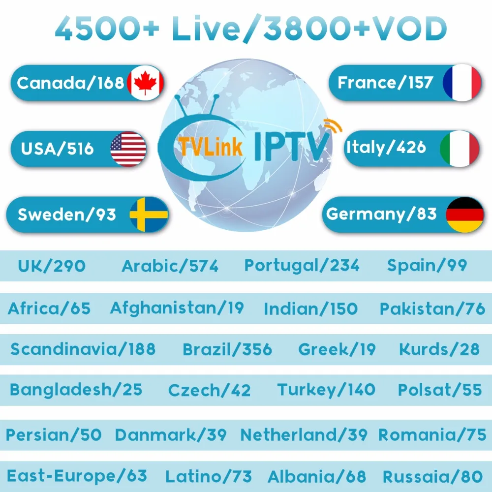 This subscription covers 4700 Live TV channels,including 500+ USA channels,168 Canada channels.if you want the full channels list,pls contact us by message.