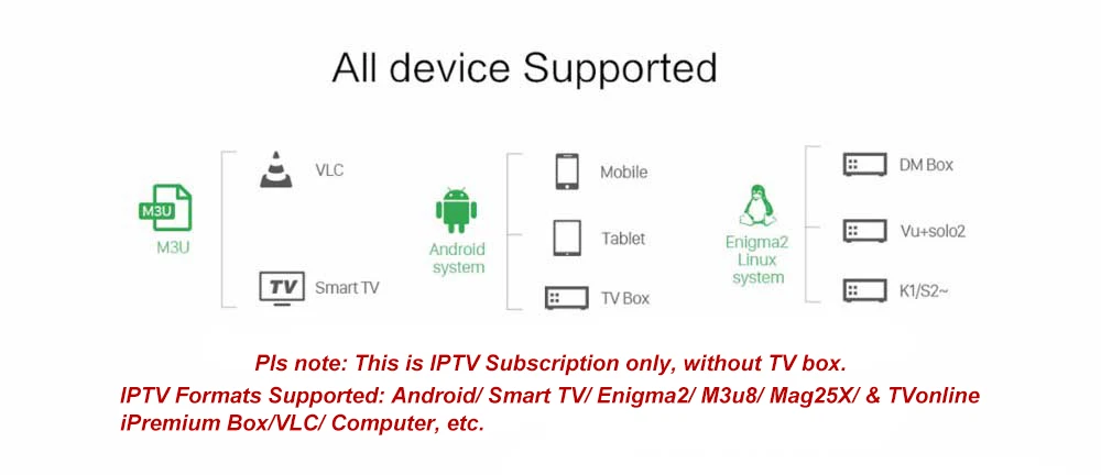 In this USA/Canada IPTV Subscription, including about 400+ USA channels,100+ Canada channels,150+ French channels,sports channels and 3800 free VOD. If you have any Android TV box, Amazon Firestick, Smart TV, Enigma2 set top box, MAG set top box, you can only buy an IPTV subscription and enjoy more than 4000 channels with any of the above device. See details as following.