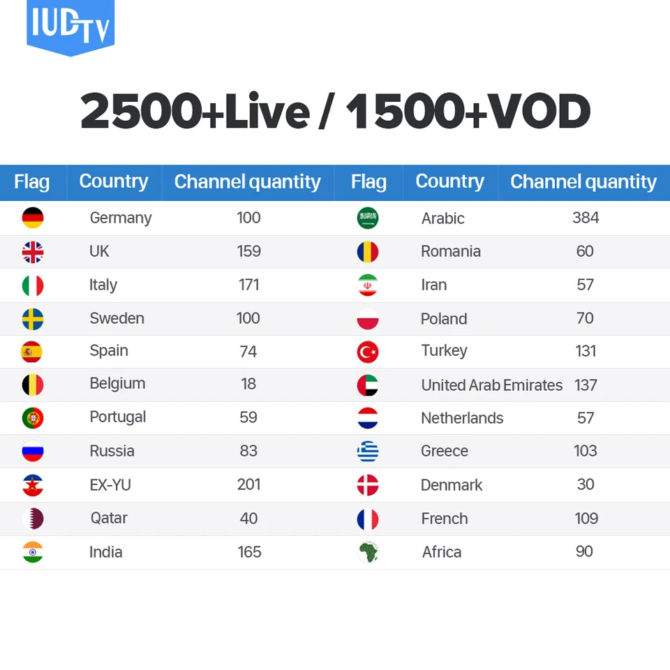 - Popular IPTV Channels: Sweden, Spain, Italy, UK, Germany, Denmark, Norway, Netherlands, Belgium, Greek, Egypt, Arabic, French, Africa, India.