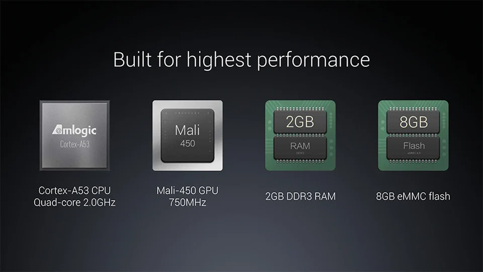 CPU: Cortex-A53 Quad-core GPU: Mali-450 RAM+ROM: 2G+8G