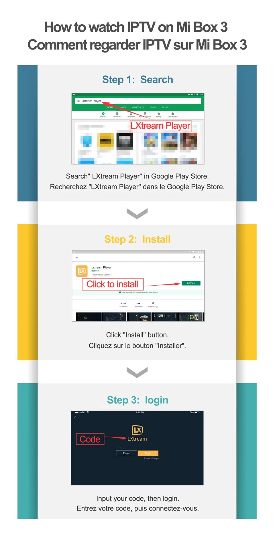 Step 1: Search"LXtream Player" in Google Play Store. Step 2: Click "Install" button. Step 3: Input your code, then login. To ensure the security of your code, We have upgraded the way to get the code, the tutorial will be sent via order message, if you have any problem, please contact us immediately.