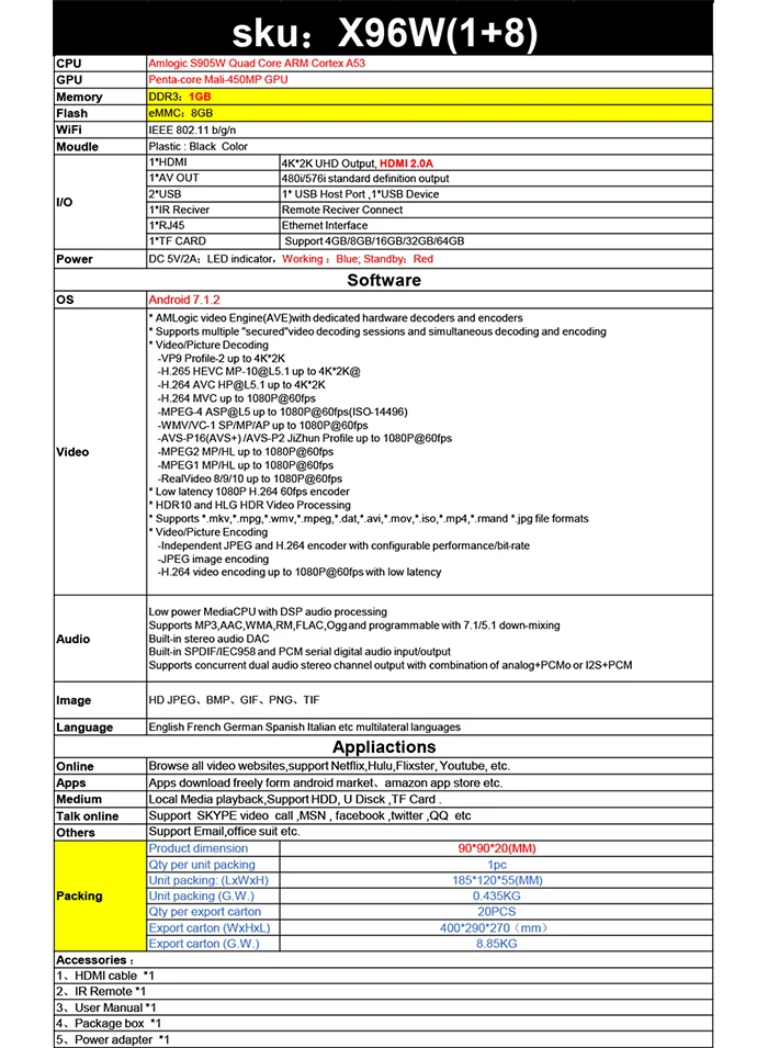 GPU: Penta-core Mali-450MPCPU: Amlogic S905W Quad-core 64-bitOS: AndroidVideo Output: HDMI 2.0Bluetooth: NoMemory: 1G DDR3Internal Storage: 8GB eMMCWireless: YesEthernet: 100MModel Number: X96W Android Tv BoxRemote Control: IncludedWeight: 650gOTA Update: NoSystem Upgrade: NoGOOGLE Cast: NoIPTV: YesPower: DC 5V,2AMax. Extended Capacity: TF Card Up To 64GB Brand Name: X96Name: X96W Android Tv Box With SUBTV CodeCPU: Amlogic S905W Quad Core ARM Cortex A53GPU: Penta-core Mali-450MP GPUMemory: 1GBFlash: 8GBHDMI: 4K*2K UHD Output, HDMI 2.0APower: DC 5V/2AOS: Android 7.1.2Wifi: 2.4GSUBTV Package 1: Iptv France ArabicSUBTV Package 2: UK Portugal iptv subscriptionSUBTV Package 3: Italy iptv subscriptionSUBTV Package 4: Turkey iptv subscriptionFeature 1: 4500 live channelsFeature 2: 8000 vod channelsSupport: 24 hours free test code