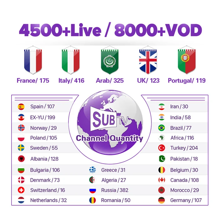 Up to 4500+ Live and 8000+VOD, the most cost-effective Iptv in the world. More than 200 French Channels, and 2000+ French VOD movies, TV Series. There are Full HD French Live channels . More Stable and Smooth. Thousands of the latest HD movies and TV series keep updating, let you enjoy the private cinema.
